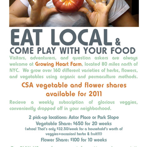 We made a CSA flyer!  Please help us pass it along.  We added a new pick-up location in Park Slope (Thursdays) and a 2nd pick-up night at our Astor Place location (now Mondays and Thursdays).  So amazing seeing all the baby sprouts in our greenhouse already.