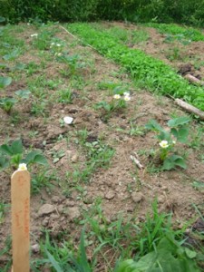The strawberries Molly gave us are blossoming. Clip their blooms the first year, and we'll get way more berries next year. Delayed gratification, like most of farming.