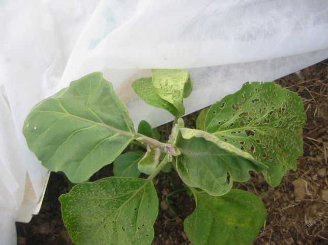 A couple of weekends ago we found that our eggplants were covered and flea beetles and most of the leaves were so eaten-through that they were like lace. So, after a little internet research (yikes!) we went out and killed as many of the bugs as we could by hand. We made a few passes throughout the day, then we covered the plants with a cloth row cover (which is what we should have done as soon as we transplanted them). When we peeked under the cover this weekend the difference was amazing. Hardly any damage to the new leaves at all. We win!