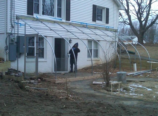 anthony after a hard day of work in the cold. the side walls are mostly in place. We have some details on the path, the door frame, and the electrical box. then we will need to flash both sides of the header. we are still not sure of the best solution below the header.