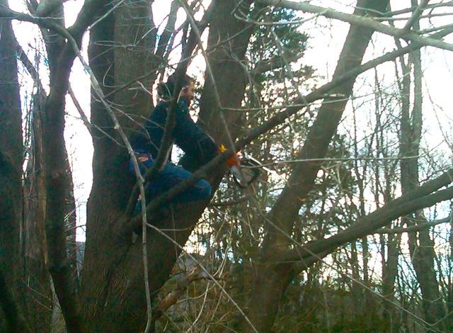 immediately due south of the solar site is a tree that would knock out several hours a day of electric production. the plan is to do an aggressive prune of the tree and then build a treehouse in it. jesse uses a chainsaw as an extension of his fingers. he climbed in the branches and made fast work of this tree.